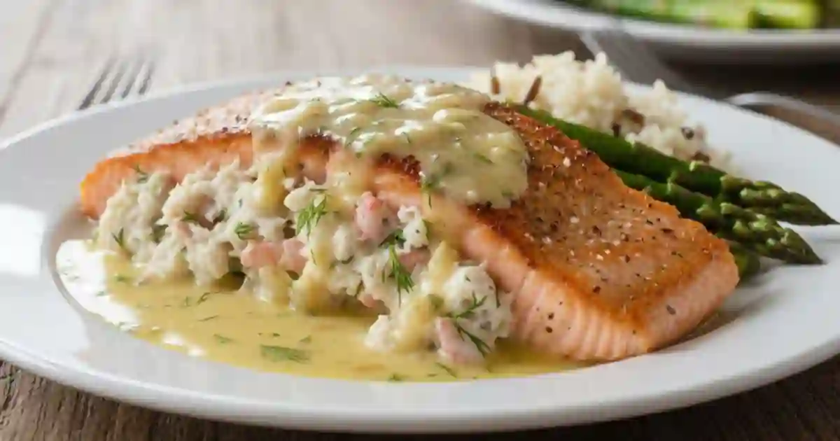 This crab and shrimp stuffed salmon delivers restaurant-quality flavor with surprisingly simple steps. Thick salmon fillets are filled with a rich yet light seafood stuffing, then finished with a bright lemon butter cream sauce that enhances the fish without overpowering it.