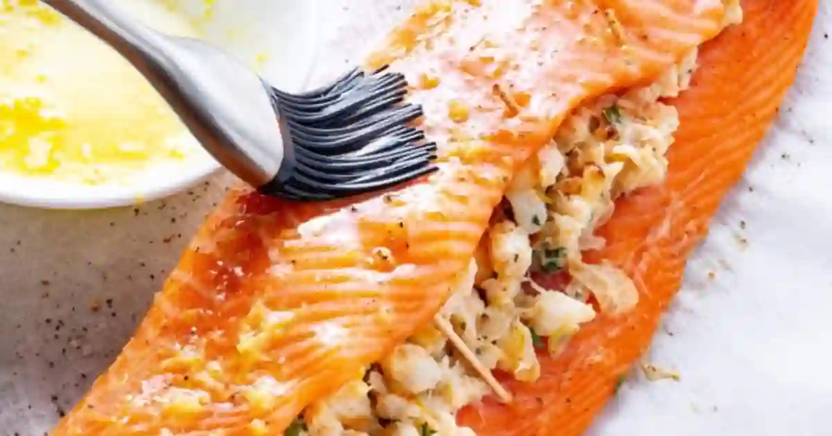 Crab and Shrimp Stuffed Salmon with Lemon Butter Sauce